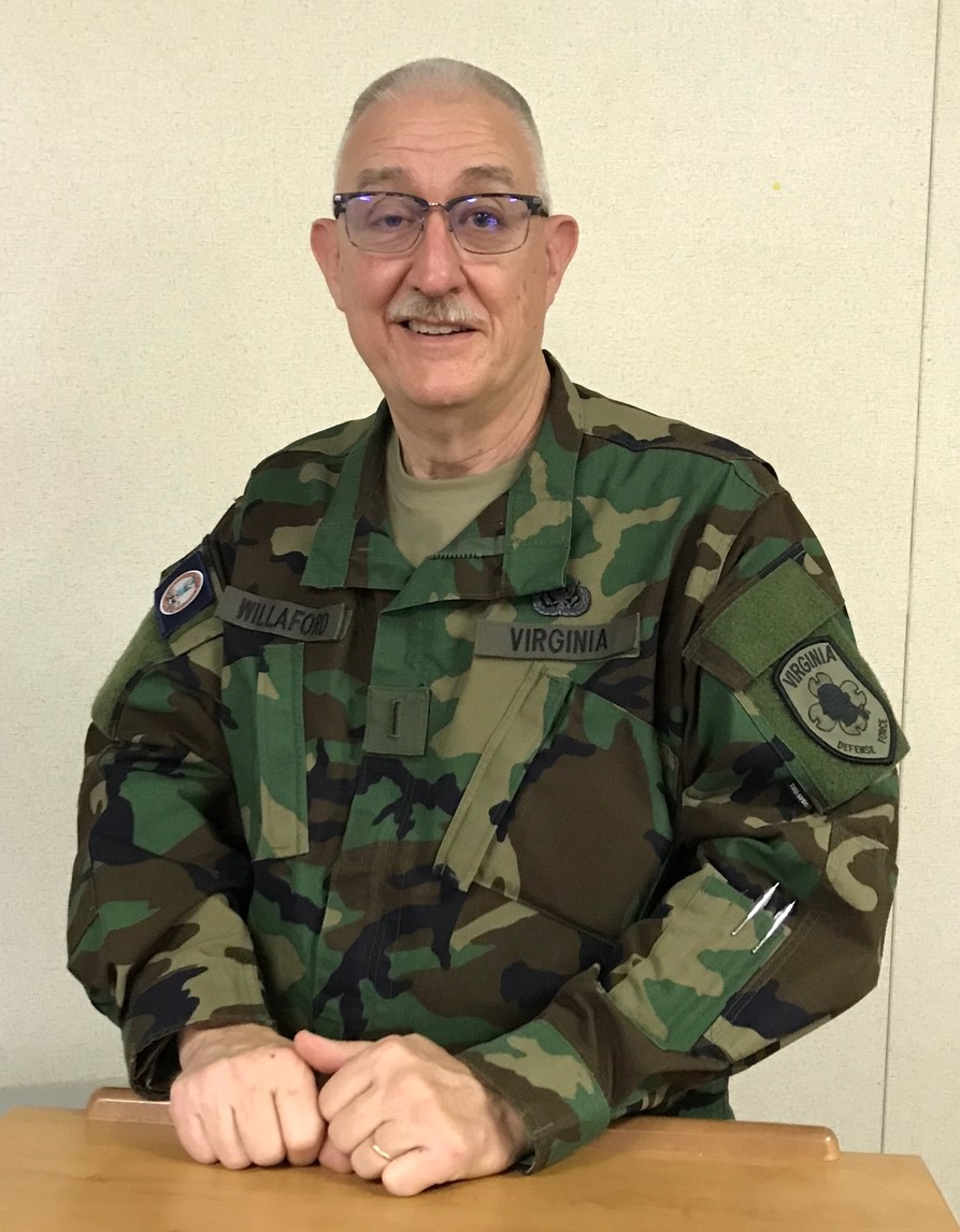 Willaford joined the VDF in 2018 initially assigned as the G3 training officer in charge and later as the Virginia Department of Emergency Management Division 5 Liaison Officer.  Prior to the VDF, he served nearly 31 years in the U.S. Coast Guard Reserve, rising through the enlisted ranks to CWO4.  As a CWO, Willaford served in multiple assignments, including: Special Agent, CGIS Commandant’s Protection Detail; Assistant Shoreside Security Officer, Port Security Unit 305; Command Inspection Team, Deployable Operations Group; Internal Security Officer for Military Commission Trials, JTF Guantanamo Bay; and law enforcement boarding team member, Sector San Juan.