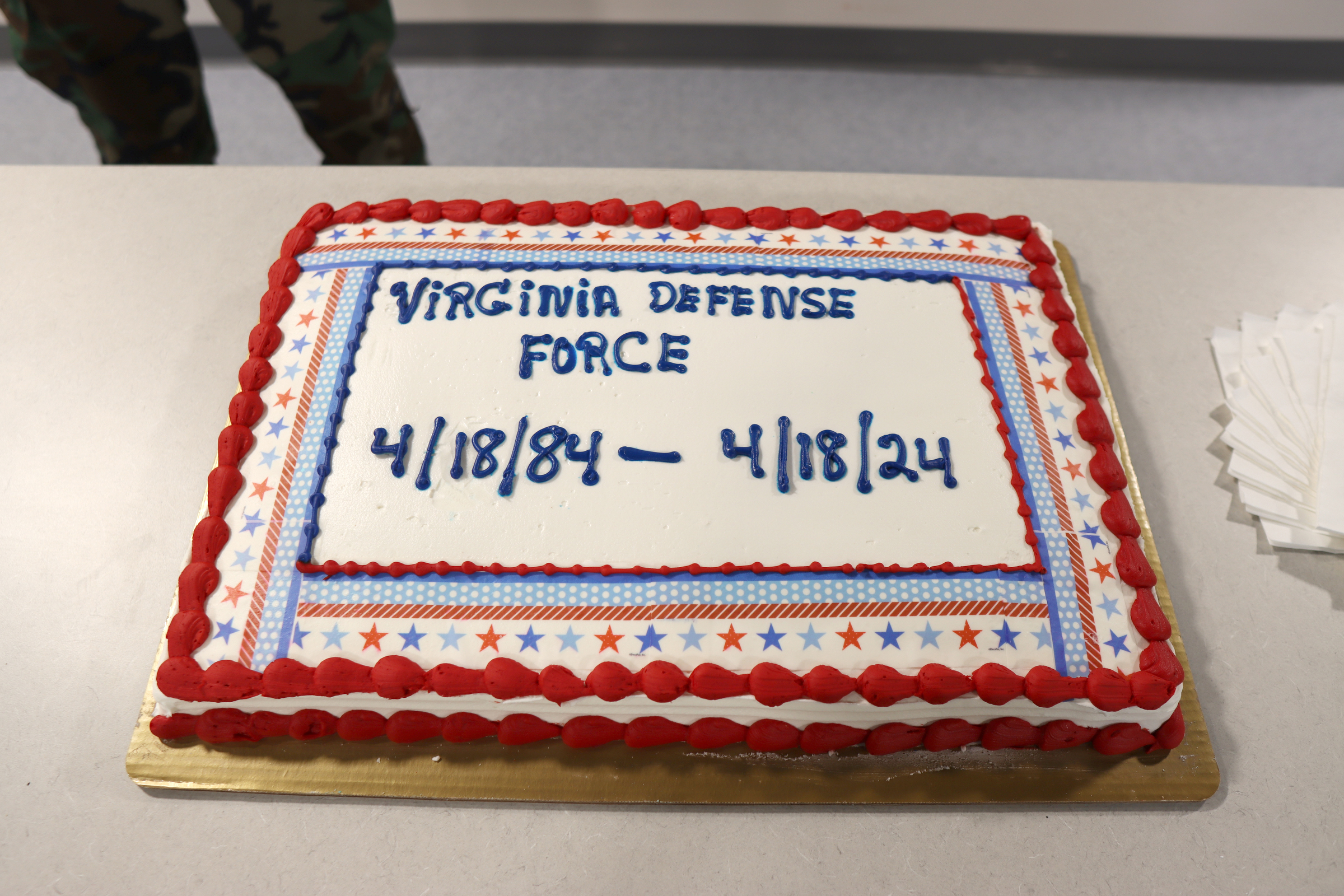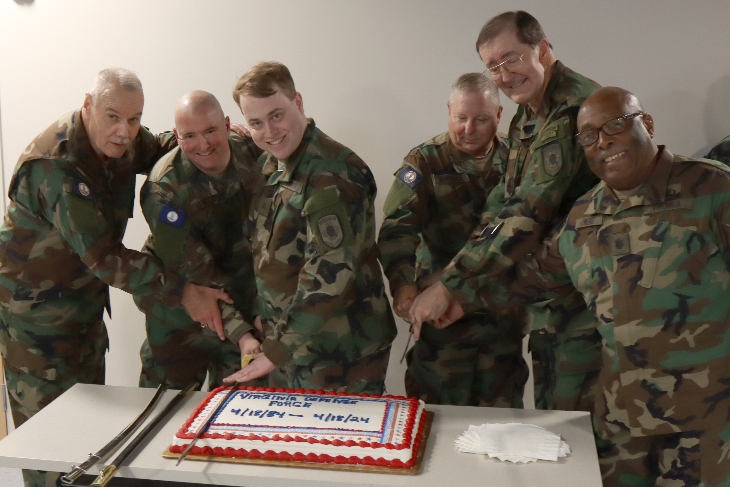 RICHMOND, Va. — Members of the Virginia Defense Force observe the organization’s 40th birthday with a cake cutting May 4, 2024, in Richmond, Virginia. With roots going back to the Virginia Volunteers in World War I and the Virginia Protective Force and Virginia State Guard in World War II, the VDF was formally re-established April 18, 1984, and now serves as the all-volunteer reserve to the Virginia National Guard.